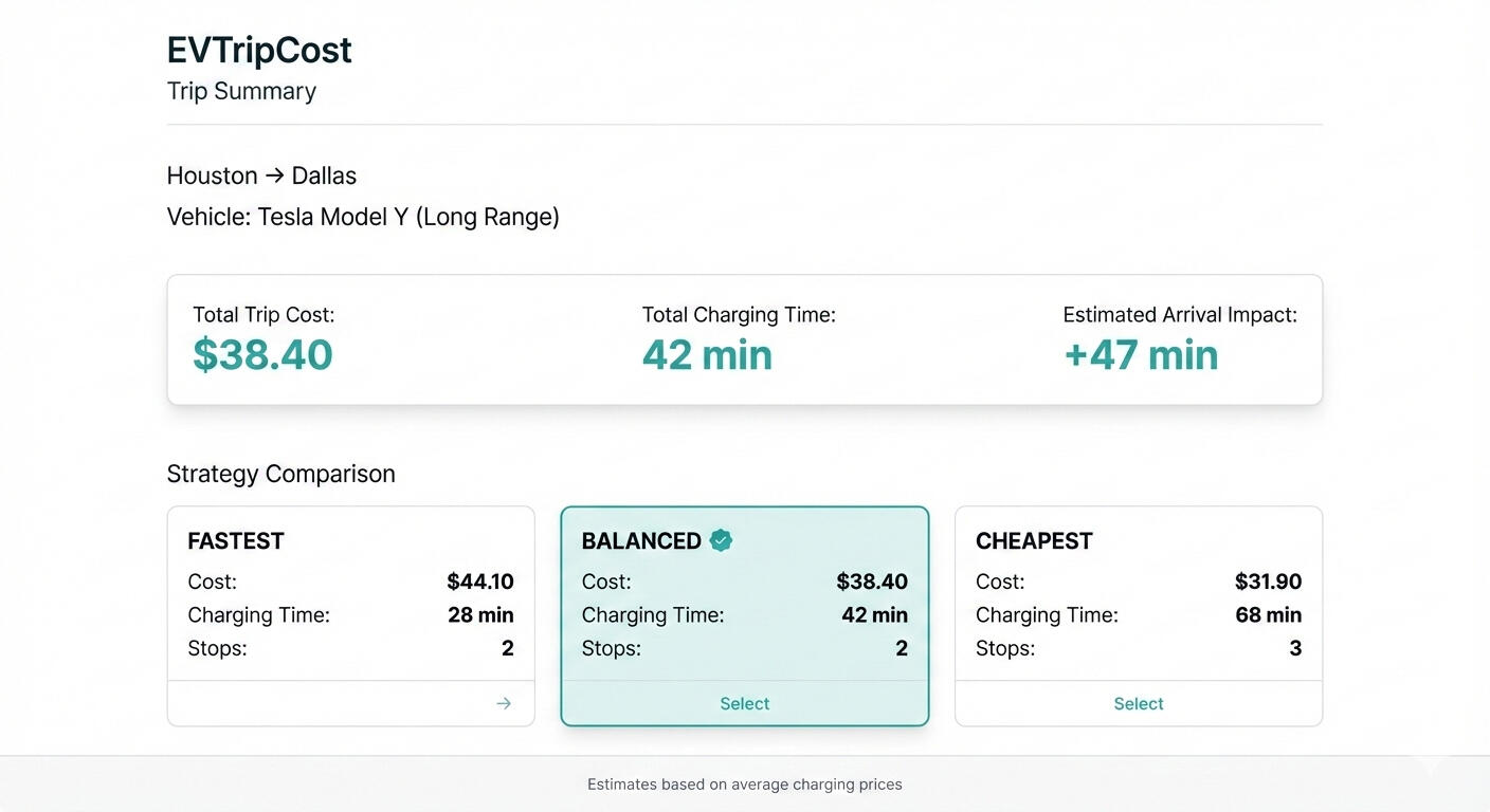 EVTripCost estimates trip cost, charging time, and stop strategy so you can choose the fastest, cheapest, or most balanced option with confidence.